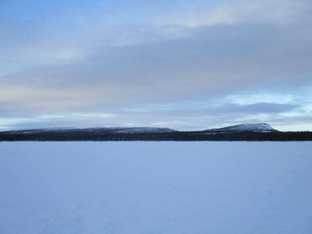 As the stream entered a large lake the trail naturally disappeared, there was simply too much wind here. Some times the ice cracked a bit and we could see water. This worried us a little. Later on we learned these worries were unjust, at this time of year you can drive a truck over the lakes, the ice can be up to a meter thick.