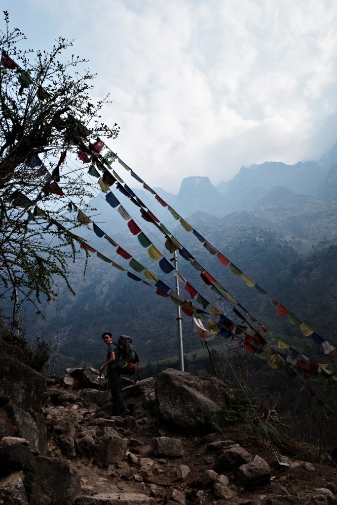 We grab our stuff and started to hike towards the prayer flags on the slope right behind the town. The clouds were already starting to role in via the valley floor so we hiked as fast as we could. We made it to the prayer flags just in time for a few nice photos. But after just two minutes the clouds rolled in and we found ourselves once more in the mist. Rose and I nevertheless decided to hike further up. Our initial plan had been to climb the Samdo (5100m) and enjoy the view from there. We still had a bit of hope that if we would hike fast we could still climb till above the clouds.