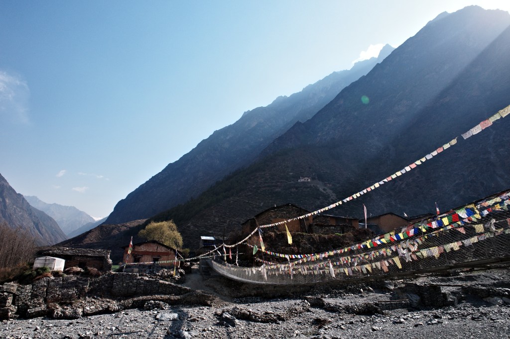 We followed the gentle slopes along some smaller villages till we reached the large suspension bridge that marked our turn into the Tsum valley. One week from now we would return here to cross the bridge and start the Manaslu circuit, but now we turned north east into the Tsum.