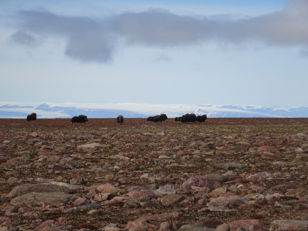 It was cold and windy for most of the day, but as the day progressed we did get better and better views of our surrounding. The rolling landscape around us was vast and colorful in the sunlight. I knew most of Inglefiled land consisted actually not of the coast line valleys we had seen around Etah but this landscape. It truly looked like Tibet on sea level. As we hiked south we saw multiple musk ox herds including one from really up close.