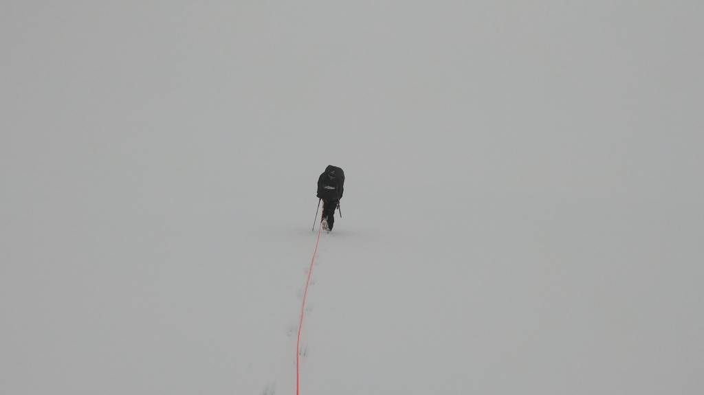 It had been a relatively warm night. Which in itself was nice, but the snow conditions were quite terrible. We were just going 2km an hour. As per usual the clouds had set in and everything around us was white. We once again had to rely on our patented rope group gps navigation technique…