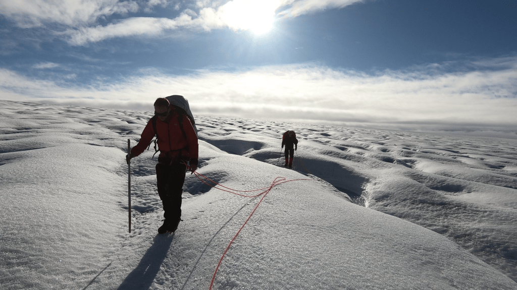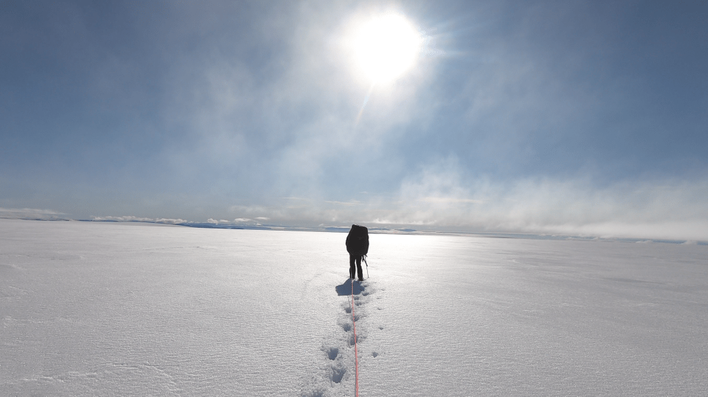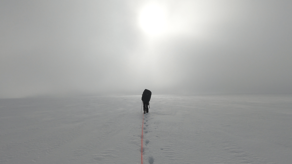 It had been our first day on the ice. Rose and I had by now spent so many nights on ice that we were almost accustomed to it’s discomforts. What I was less accustomed to though, was the thick mist around us. You could literally not see anything. Just pure white. You could not see where the ground gave way to the sky and vice versa. You could barely see the ground right in front of you. Due too everything being white all details simply disappeared. If you set one foot in front of another it was in pure faith that the ground had to be somewhere. Sure I had seen mist before, but here on the ice cap, with no details on the soil and no gradient in the terrain it was something else. It was extremely disorientating. The mist did not look like it would clear up any time soon and we knew that a major storm would hid on Monday. This meant we had no option but to continue our way through the mist. (trust me you don’t want to be high on the ice cap in the middle of a storm) Hiking in a straight line was very hard. The second person on the rope had to constantly check the gps and yell ‘left’ or ‘right’. This way we slowly but steadily zigzagged our way north west.