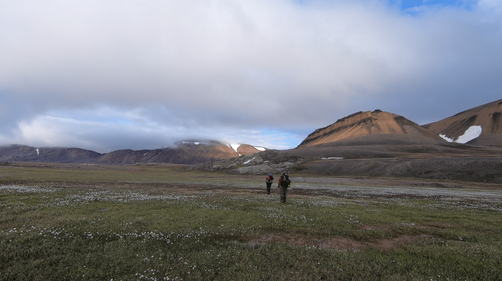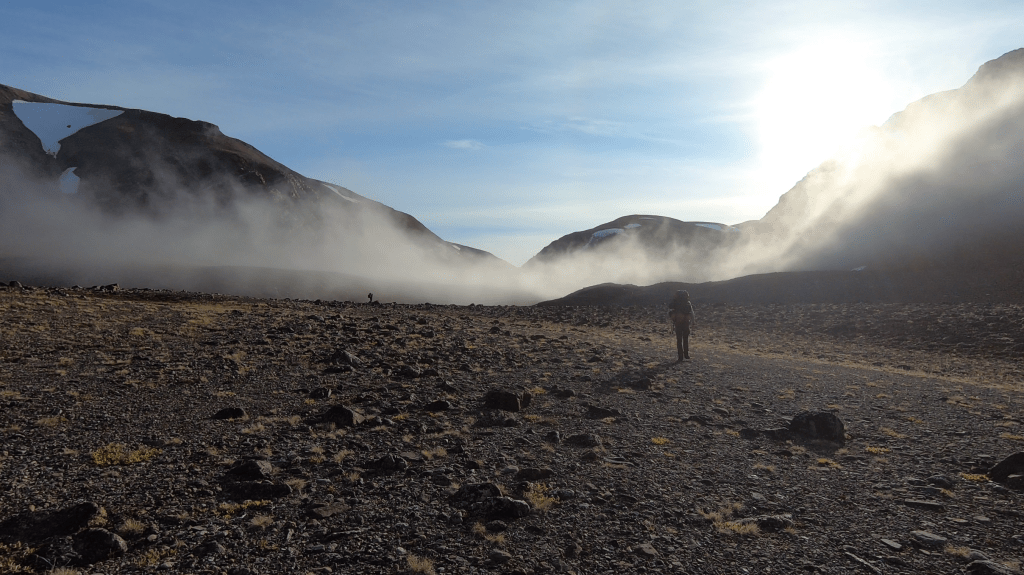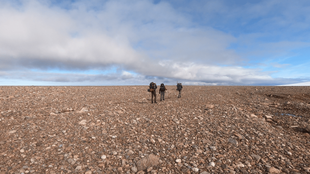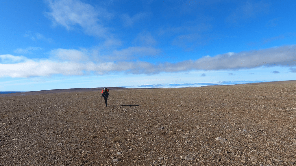 There were some low hanging clouds adding a mysterious atmosphere to the valley we entered. The valley was small and secluded with some small glaciers on both sides, it kind of felt like being in eastern Greenland way further south. It also felt like there would be some pass at the end of the valley. The landscape so far north is simply confusing and unearthly. Because of course their would be no pass, instead the valley sides got lower and lower and the vegetation thinner and thinner till we found ourselves on the interior plateau. A vast gravel plane stretching as far as the eye could see. I joked that it kind of looked like ‘Tibet at the sea side’. There was no detail in the landscape at this point, and we could hike as fast as 5km per hour. There were 2 minor gorges but for the rest it was basically straight ahead.