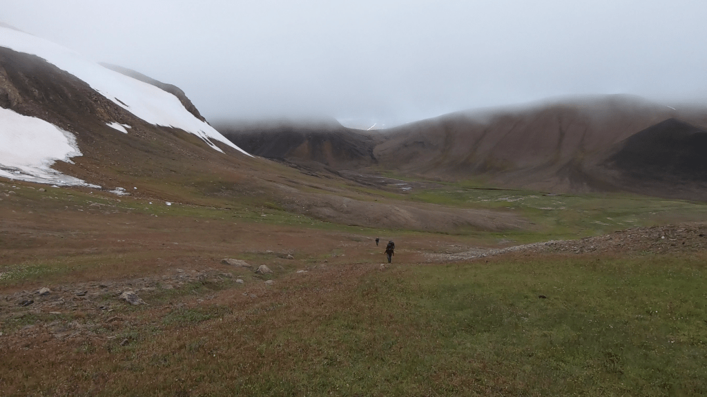 We made quick progress and though cloudy the weather was not too bad. At lunch time we had already covered around 7km. By times we could see the ice cap behind the mountains north of us through a gap in the clouds. We could not see the whole way up as it started to cloud up further, but it definitely looked like we would need to cross some fresh snow.