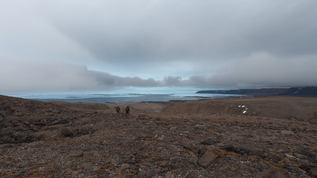 It took us a while to find a good way down to the sea. As per usual the flat terrain terminated in steep cliffs. As the weather was cleaning up it was a nice hike down. Typical polar landscape, steep cliffs, rock beds, tundra and a sea full of ice.