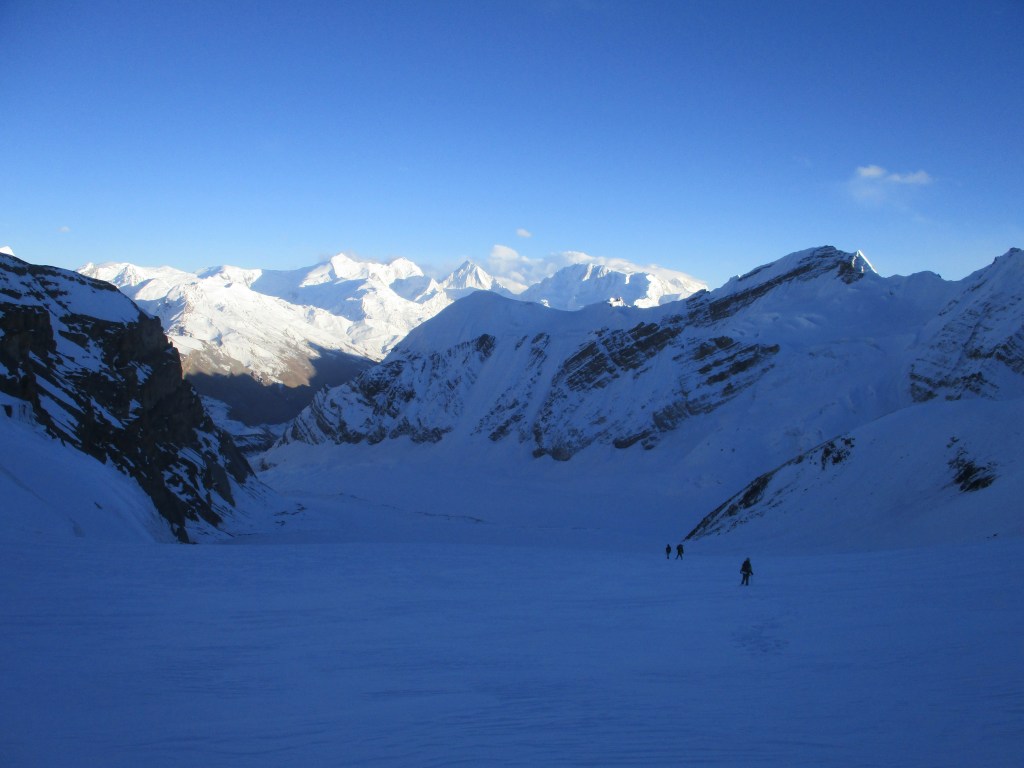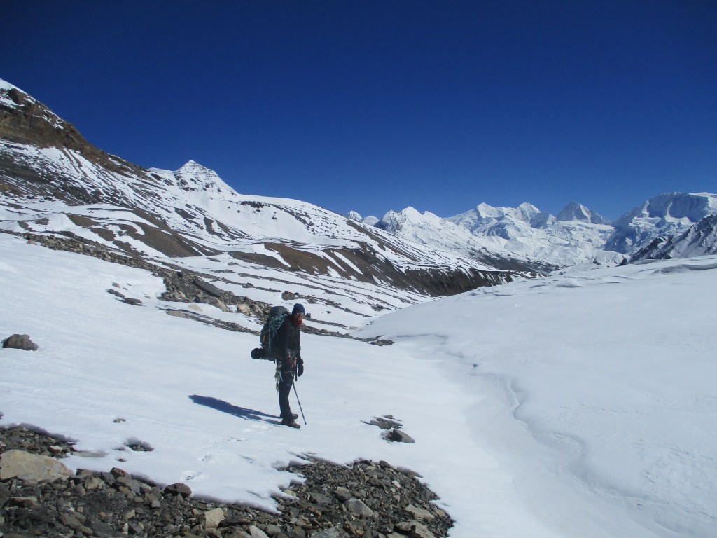 Once on the pas itself, we had a great view over the Damodar Himal south of us and over Tibetan mountain to our north east. We could see the Saribung glacier that we would need to climb the next day below us. The snow situation seemed to be somewhat under control as far as i could make out.