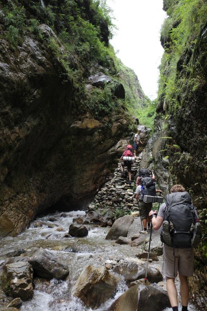 We did not dwell in Kolti as we still had a long day ahead of us, climbing up over 1200m. We slowly started the very first steps of the trek. After climbing about 50m we already found ourselves in quite an enchanting place. We followed a small stream into a canyon with steep walls on both sides of us. We crossed the water regularly and came across a nice waterfall.