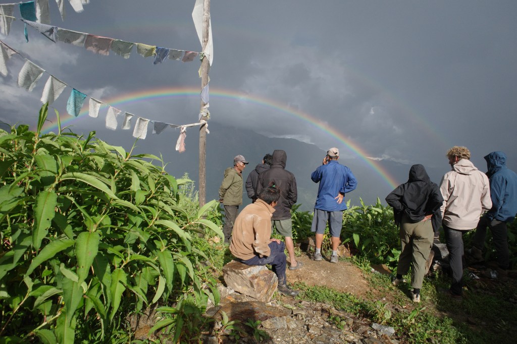 I had started to loose hope seeing Saipal at all, but in the morning, out of nowhere, the clouds did ease a bit and the top of mount Saipal showed itself. Later in the morning a rainbow even got through.