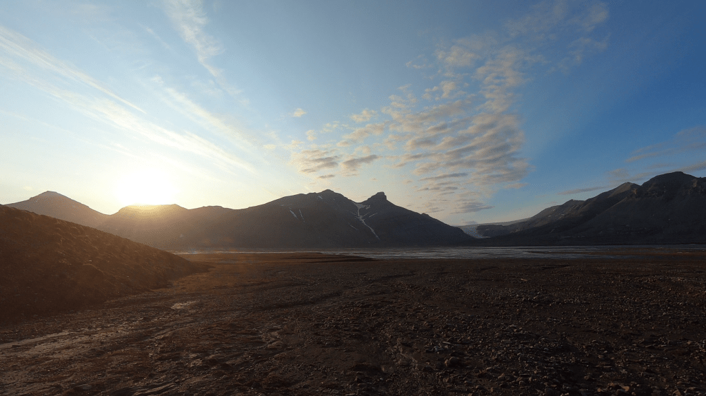 On top of the pass the descend looked indeed steep but manageable. With Pyramiden just 10km away it felt like we already made it. The impressive Mittag Lefferbreen in the midnight sun definitely looked like a worthy goodbye view.