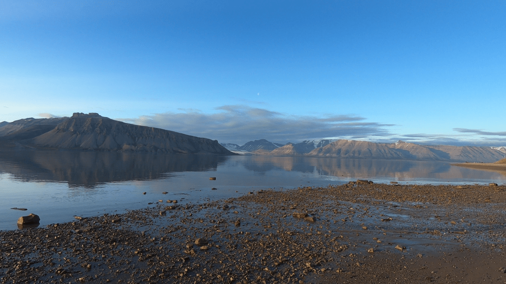 Once down we arrived in Horbyedalen. A broad valley coverd by old and overgrown moraines. It was here that we crossed our final river and made it back to the Isfjorden coast line. The weather was stunning and silent. We could not have wished for a nicer last day. The silent waters of Isfjorden reflected the surrounding mountains perfectly.