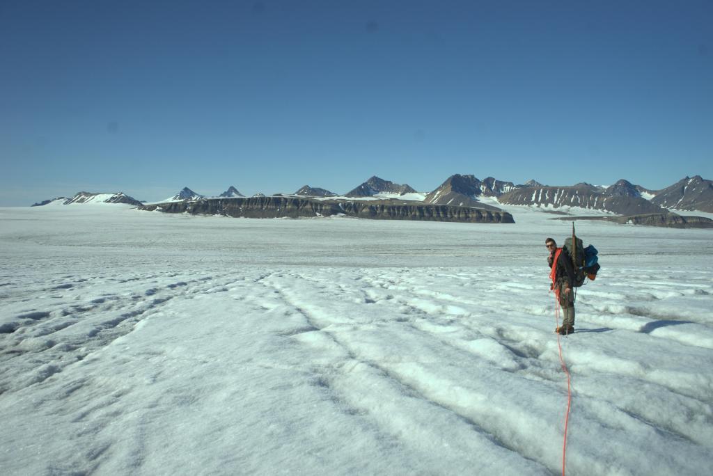 We started our day with an ascend to the Droning passet. Our aerial images seemed to suggest that on the way up the ice would turn into snow. Even though this was hard to imagine when we were in camp it turned out to be pretty accurate. At around 600m high the ice glacier became a little more snowy and we roped up for the last stretch to the pass itself. We were now on the upper reaches of the Kongsvegen and had a really great view over the wide glacier and many nunataks rising up from it.