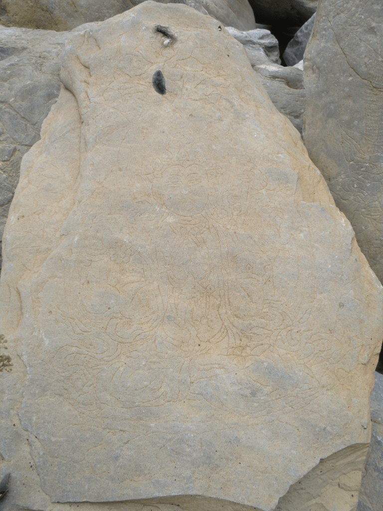 We had to pay attention to keep track of the trail, but it was never gone for long. Around 1pm we finally saw the descend down to the river. The cliffs eased and made way for meadows. We descended about 200m down. It was clear that people visited this place with their cattle every once in a while. We could see stone man, Mani walls with Buddhist inscriptions and some deserted stables and houses.